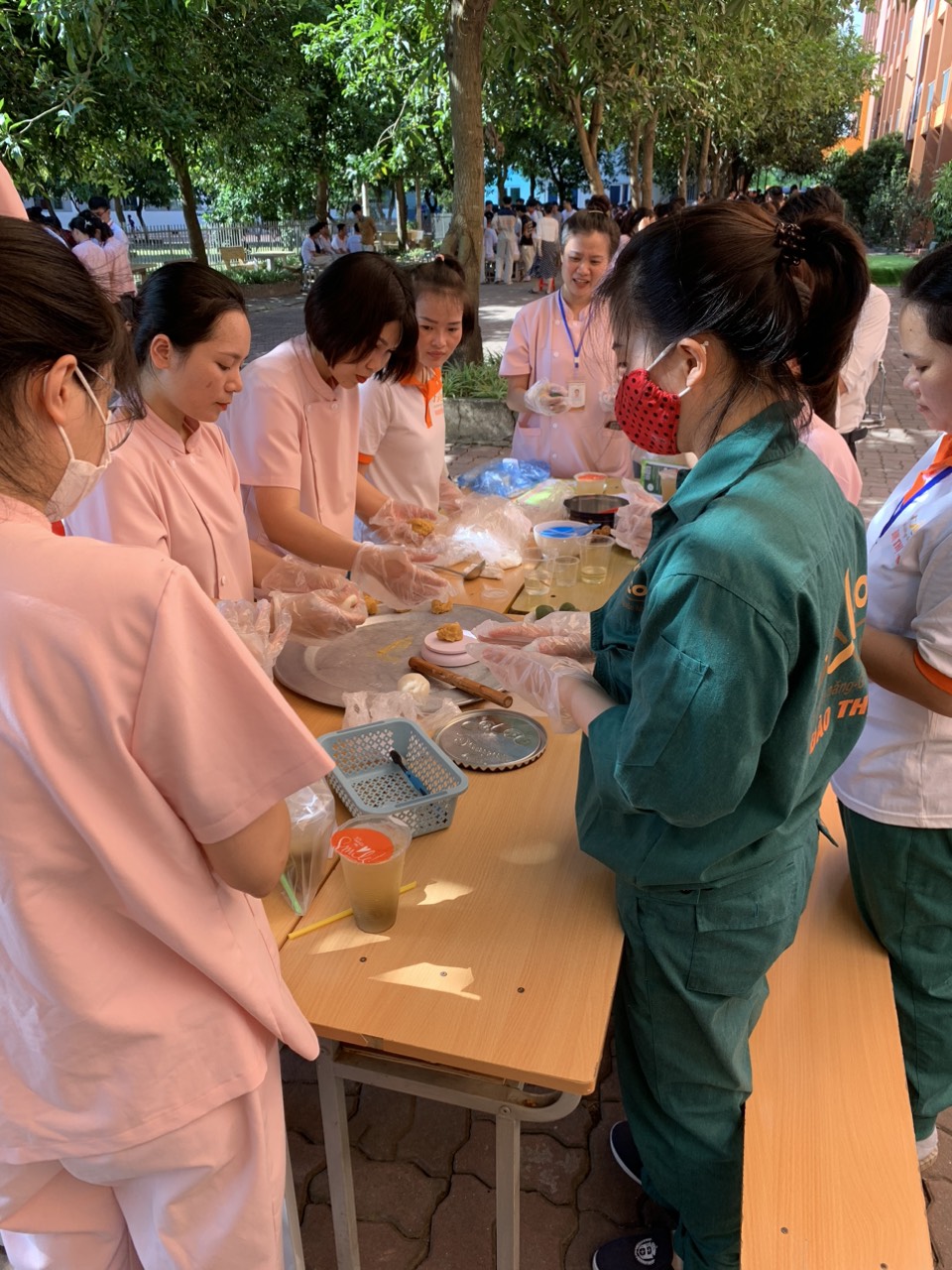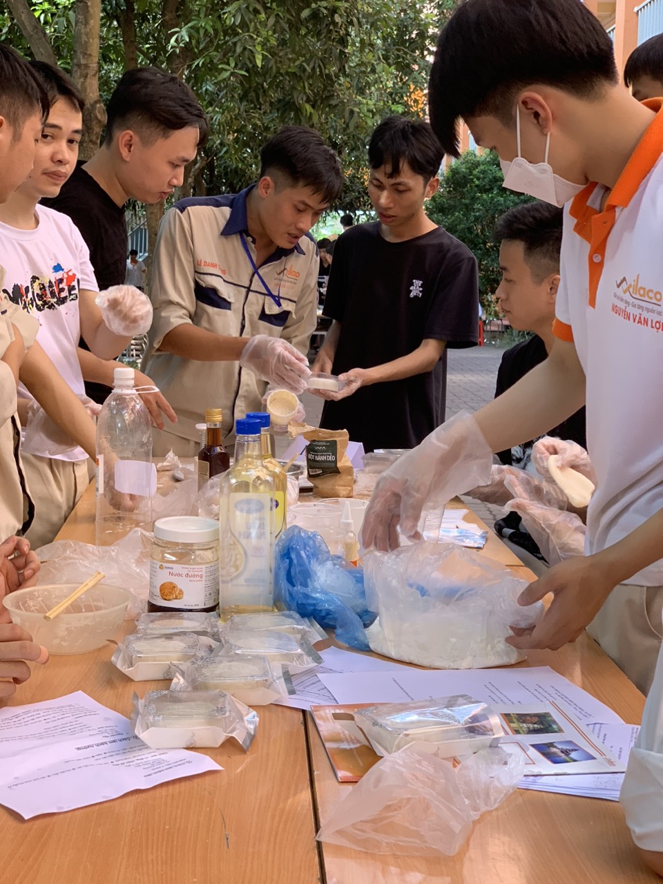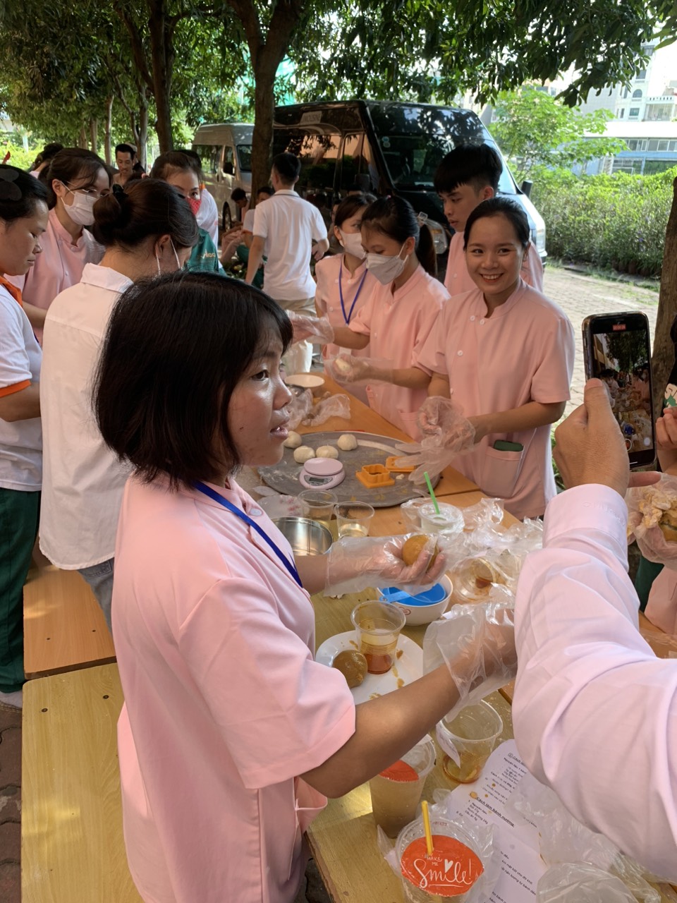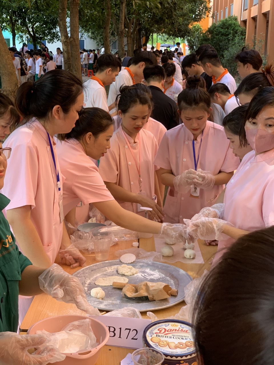Trước sân trường trung tâm đào tạo, khung cảnh náo nhiệt của các các bạn học viên bàn luận sôi nổi về cách pha chế bột, cách nặn bánh đều tay, chế biến nhân và nướng bánh sao cho đẹp màu dưới sự giúp đỡ của các thầy cô giáo, trợ giảng để các bạn nhanh chóng có thành phẩm đẹp nhất.